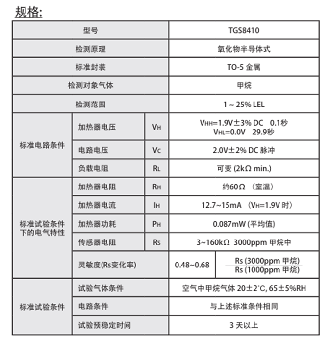 以下是甲烷傳感器TGS8410傳感器的具體規格: