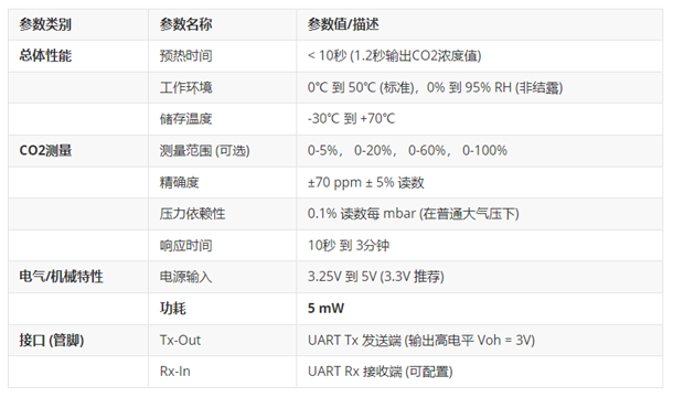 在這里,深圳市新世聯科技給大家推薦一款公司代理的英國GSS小體積緊湊型NDIR CO2傳感器---MINIR/ExplorIR-M傳感器,其功耗顯著降低至僅5mW,平均工作電流小于1.5mA(峰值電流33mA),供電電壓兼容3.3V。這使得它成為應用于電池供電產品和便攜式設備的理想選擇,特別適合集成到移動式或小型氣調包裝設備中,或作為無線監測節點部署。其在0-100%的寬測量范圍內(可選特定子范圍如0-5%,0-20%等),可提供±(70ppm±5%讀數)的精度,并具備極短的預熱時間(<10秒,1.2秒輸出初步濃度值)和用戶可配置的響應時間(10秒至3分鐘),采用小巧的20mm直徑探頭式封裝。