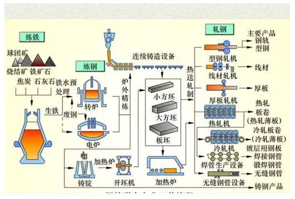 煉鐵的目的是還原出鐵礦石中的鐵元素;煉鋼的目的是降低含碳量,調(diào)節(jié)硅錳含量,去除磷硫。煉鋼主要是以高爐煉成的生鐵和直接還原煉鐵法煉成的海綿鐵以及廢鋼為原料,用不同的方法煉成鋼。主要的煉鋼方法有轉(zhuǎn)爐煉鋼法、平爐煉鋼法、電弧爐煉鋼法3類(見鋼,轉(zhuǎn)爐,平爐,電弧爐)。工業(yè)上一般鋼鐵的生產(chǎn)流程可以劃分為長(zhǎng)流程和短流程。其中長(zhǎng)流程又包含了:焦化、燒結(jié)、高爐、轉(zhuǎn)爐。而短流程則包含了電弧爐。比如:在長(zhǎng)流程中,鋼廠采購(gòu)鐵礦石通過燒結(jié)生成燒結(jié)礦、球團(tuán)礦,通過采購(gòu)焦煤成產(chǎn)出焦炭。之后將焦炭、鐵礦石、熔劑(主要是石灰石)投入高爐,通過氧化還原反應(yīng)生成鐵水,鐵水再注入轉(zhuǎn)爐煉鋼。短流程則主要投入廢鋼及少量鐵水到電弧爐中,及可產(chǎn)出鋼水。短流程出鋼耗時(shí)50分鐘,長(zhǎng)流程耗時(shí)20分鐘。短流程建設(shè)成本低、能生產(chǎn)高級(jí)特種鋼、但噸鋼邊際成本高、產(chǎn)量小;長(zhǎng)流程則相反。